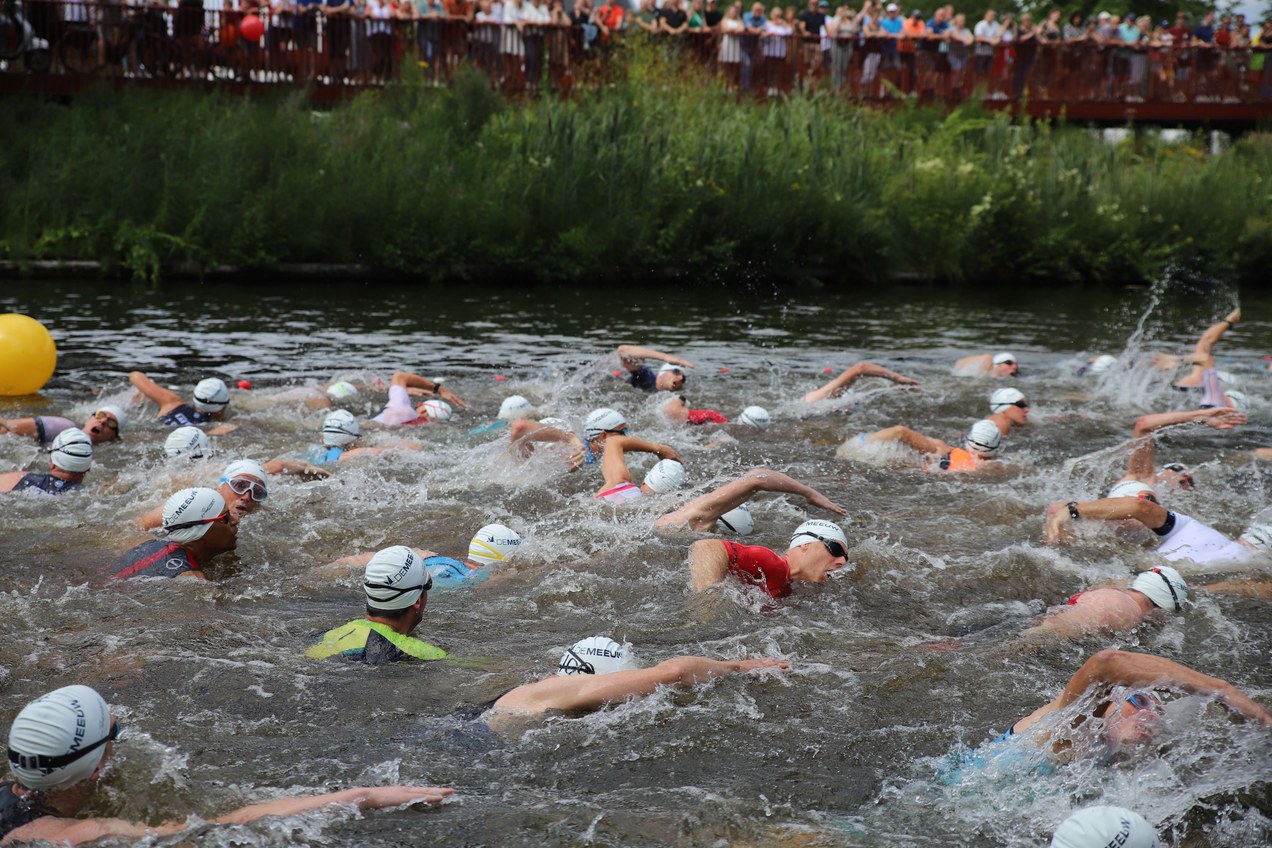 1/8 triathlon zwemmen 500 m (2 rondes) fietsen 20 km (2 rondes) lopen 5 km (2 rondes)